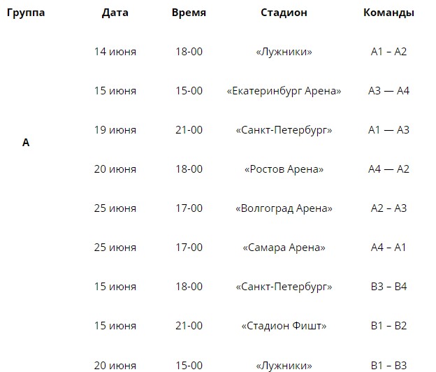В этой статье мы рады предложить вам полное расписание Мундиаля. Расскажем о времени, во сколько будут начинаться матчи, из каких групп будут выбраны оппоненты, на каких стадионах пройдут основные матчи, а также группа плей-офф.